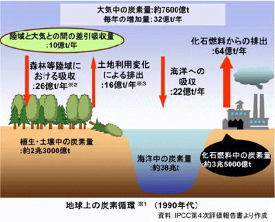 地球全体で保有する炭素は一定で、大気中に排出される炭素(CO2)が増えることが、地球の炭素の吸収、蓄積、排出のバランスを崩し温暖化の原因となります。
