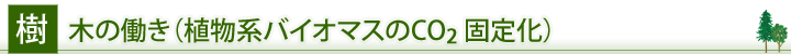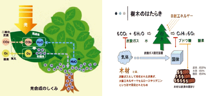 樹木は、1.5kg のCO2と、300kg の水、3760kcalの日射エネルギーがあれば光合成により約1kgの炭素化合物(ブドウ糖)を生産します。
